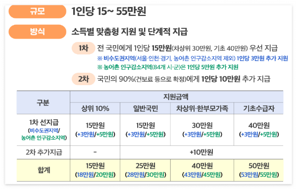 - 기본 지원금: 대한민국 국민 누구나 15만원